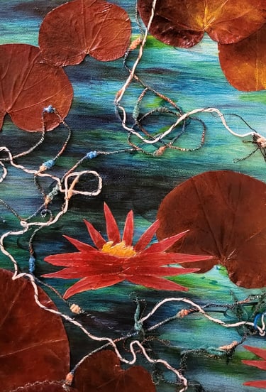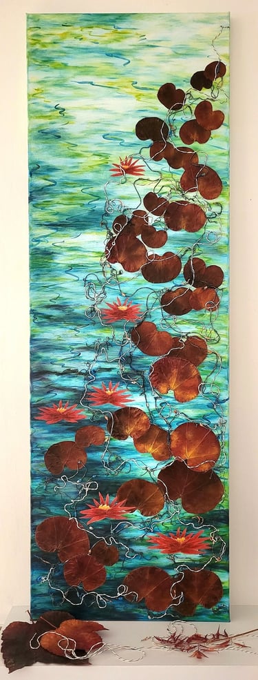 Acrylique, technique mixte, inclusion de matières végétales et textile