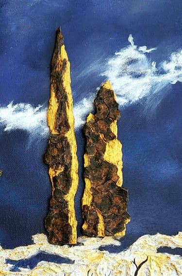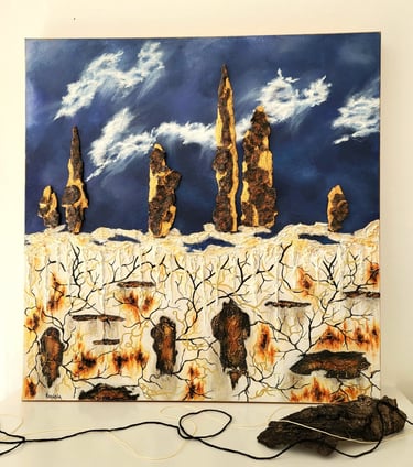 Où situer la Puissance ? Dans ces troncs robustes s’élevant tels des menhirs ou bien dans l’enchevêtrement de leurs racines dans les profondeurs de la terre ? l’énergie ressentie par la force qui émerge de ce réseau souterrain sinuant malgré les obstacles, doit vibrer en chacun de nous.