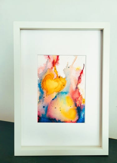 Encadrement en papier coloré et disposé dans cadre protégé.