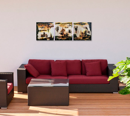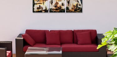 Peinture acrylique, technique mixte et inclusion de matières végétales et minérales Tryptique entoilé coton, finition vernis