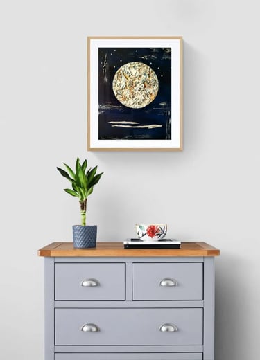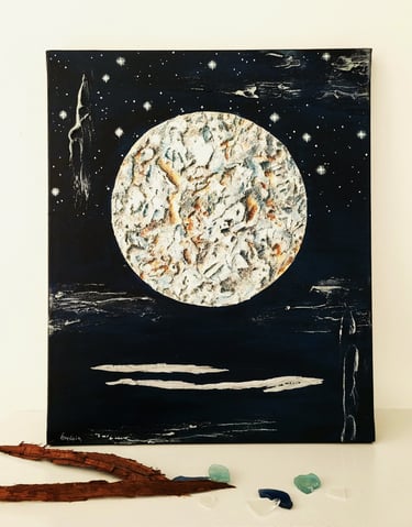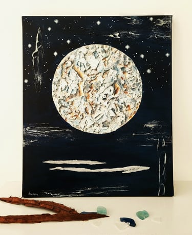 Chaque cratère, chaque nuance de Luminescence, évoque les cicatrices du temps, tandis que le fond nocturne rappelle notre place dans l’infini. Afin s’épanouir et toucher à l’éthéré, participons à cette danse harmonieuse entre ciel et terre.