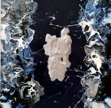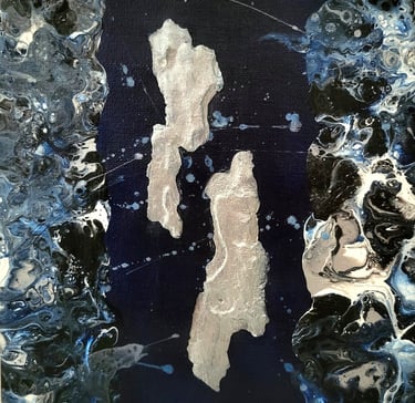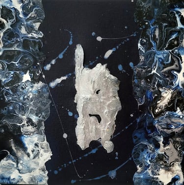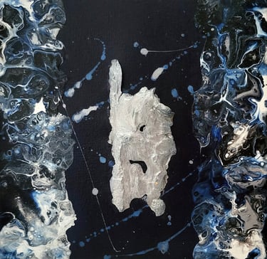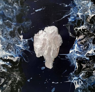 AR’CHIPELS est un atlas imaginaire où les flots indigo et les fragments métalliques dessinent des territoires à la frontière de la mer et du cosmos où la matière devient un langage intérieur.
