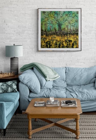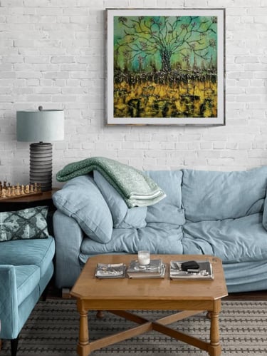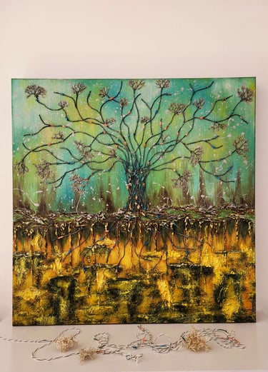 Peinture acrylique, technique mixte et inclusion de matières végétales et textile