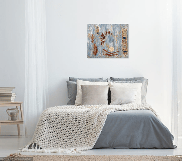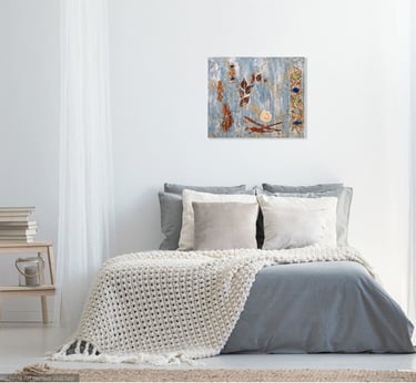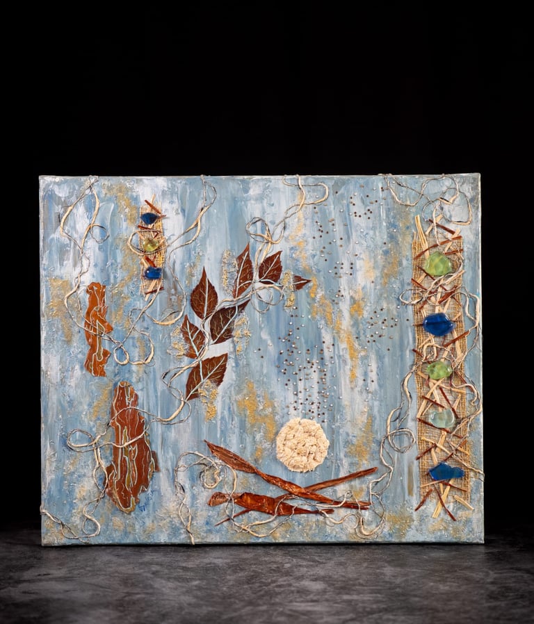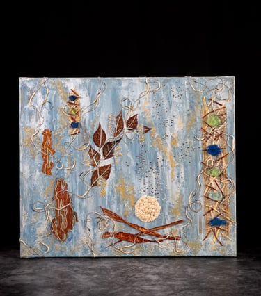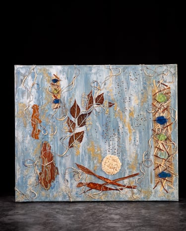 Peinture acrylique, technique mixte et inclusion de matières végétales, minérales et textile